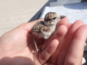 The plover chicks, once they’ve hatched, are fuzzy little cotton balls on stilts. They are well camouflaged and tend to hunker down in the sand to hide from predators. Unfortunately, this makes them nearly invisible and prone to being run-over or stepped on. Driving slowly, away from the dunes and watching where you step can help these little birds immensely.